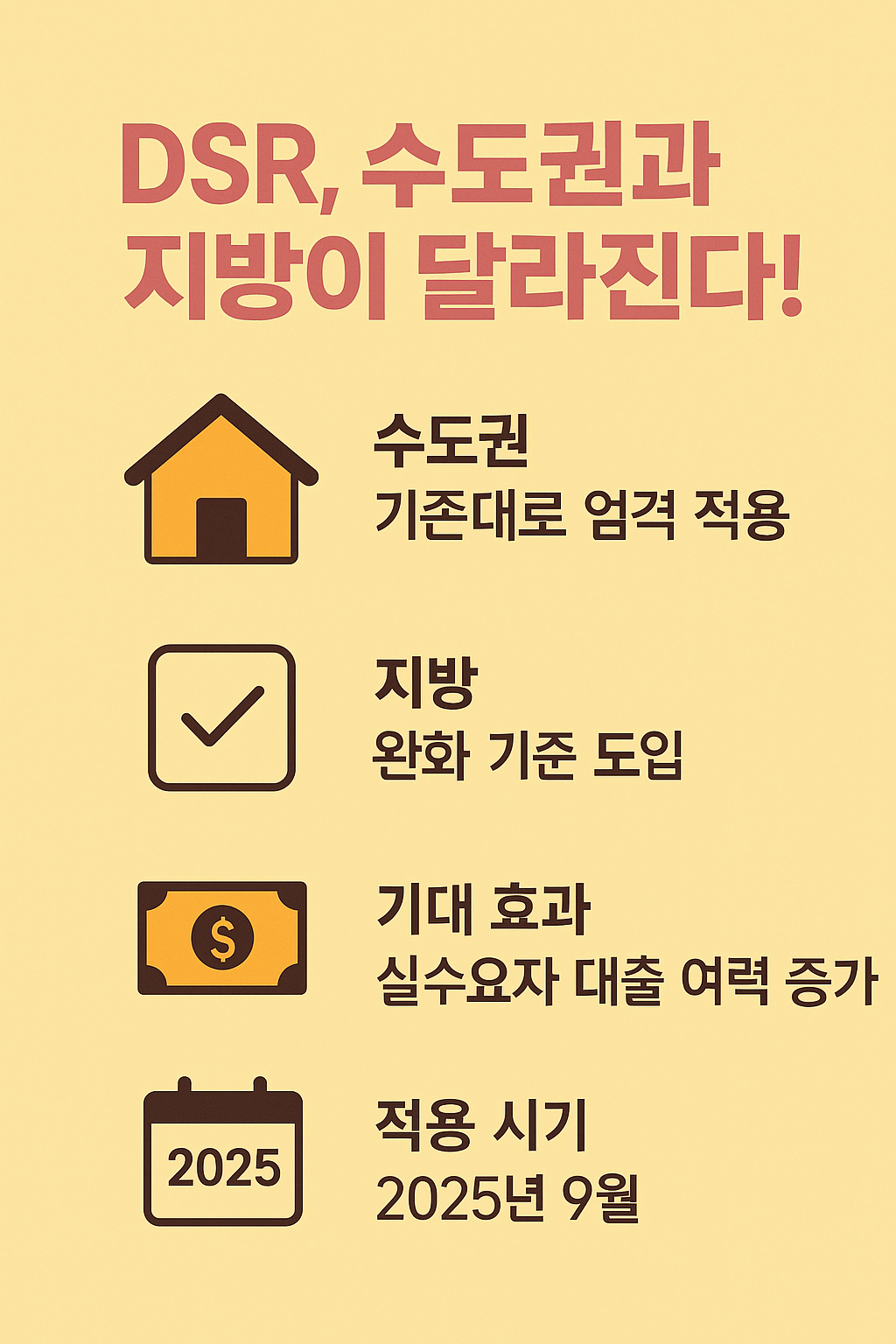 • 수도권: 규제 강화 유지 (기존처럼 엄격한 DSR 적용)