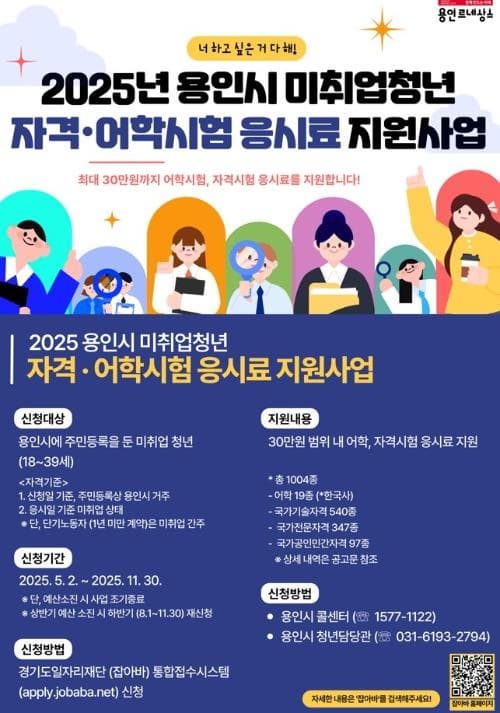 2025년 용인시에 거주하는 미취업 청년이라면 꼭 한번 신청해 볼만한 시험비 지원 사업입니다. 시험을 준비 중이라면 예산 소진 전에 서둘러 신청하세요.