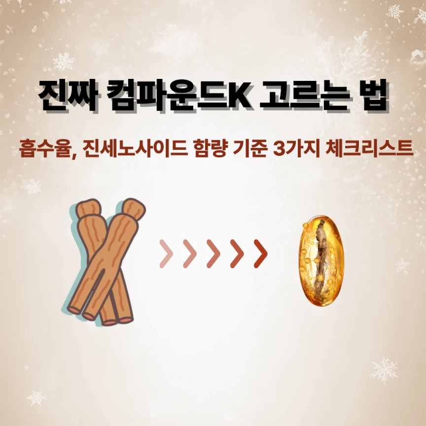 이 글에서는 효과 좋은 컴파운드K를 잘 고를 수 있도록, 흡수율과 진세노사이드 함량 기준을 중심으로 꼭 체크해야 할 3가지 핵심 포인트를 알아봅니다.