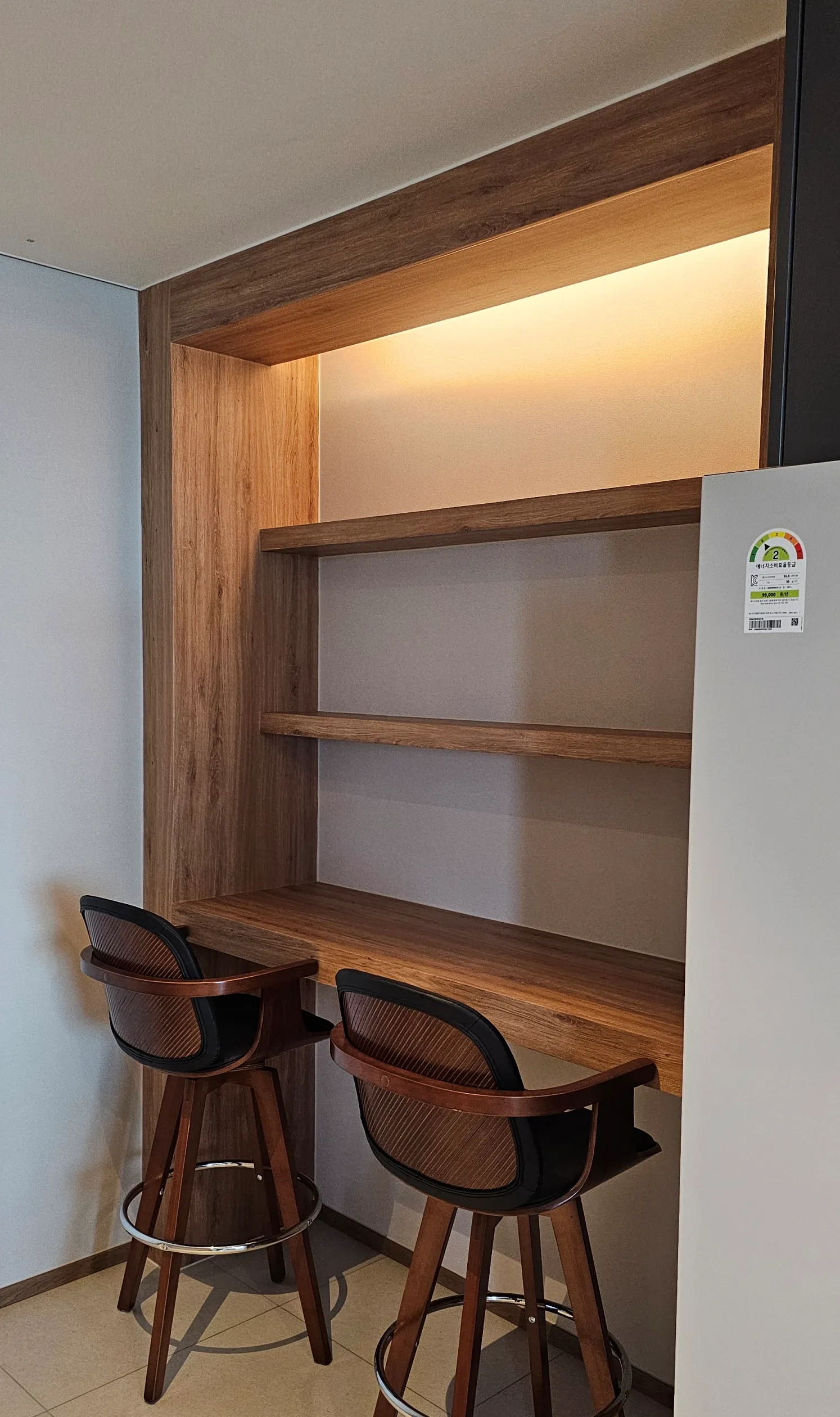 침실은 모던하면서 따뜻한 우드톤 인테리어로 꾸며져 있었고, 푹신한 침대와 암막커튼 덕분에 숙면을 취하기 좋았습니다. 1층 침실은 화장실이 딸려 있고 2층에는 침실이 2개네요. 거실에는 대리석 테이블과 미니 바 공간까지 마련되어 있었어요.
