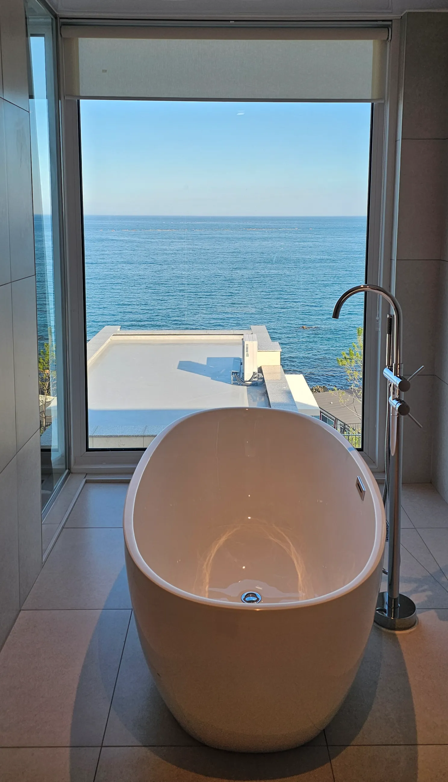 하이라이트는 욕조! 2층 방옆에 마련되어 있는 욕조에서 통창 너머로 파도치는 그림 같은 바다를 바라보며 반신욕을 즐길 수 있게 되어 있었어요.
