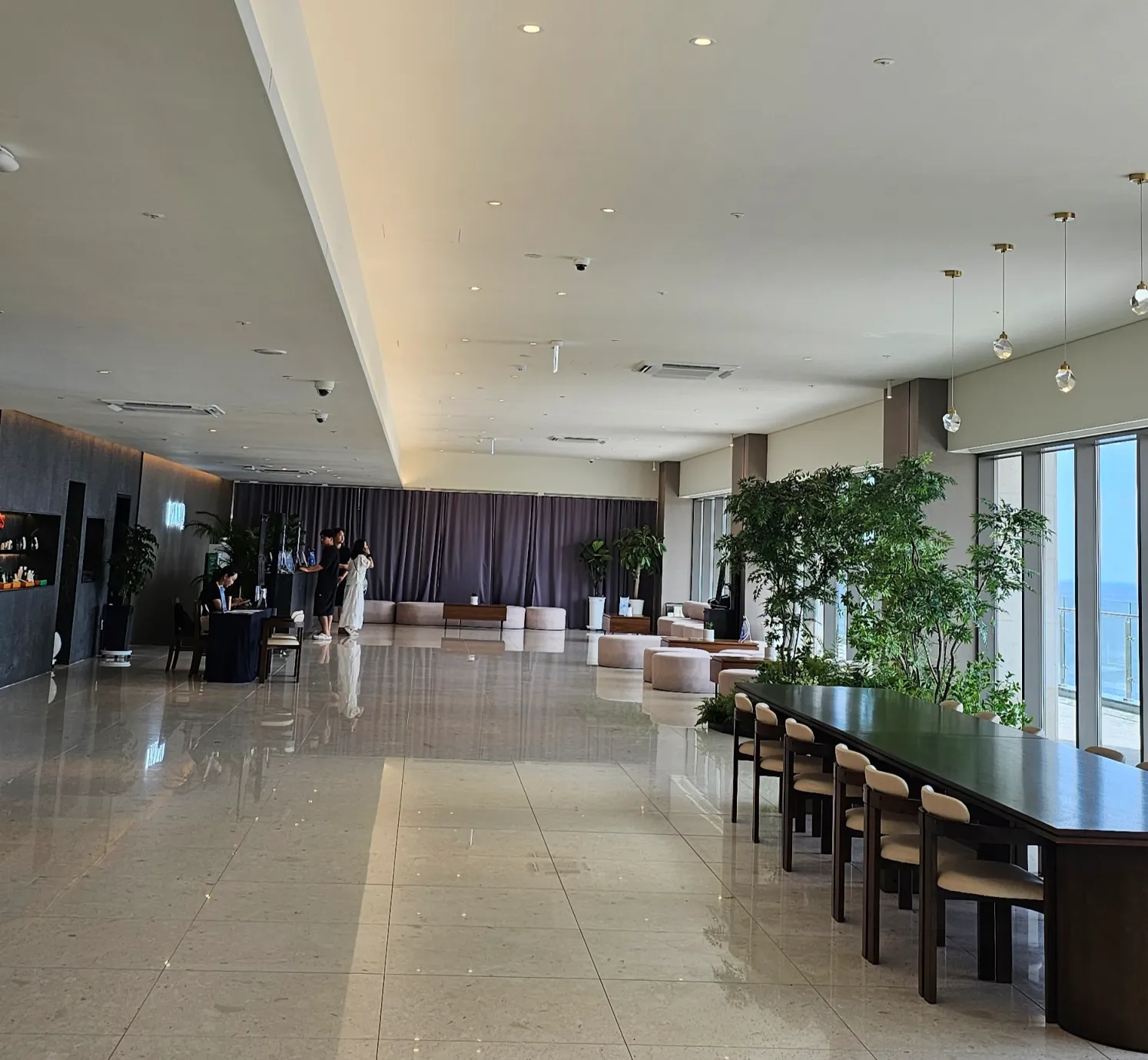 프런트 로비에 들어서자 넓고 고급스러운 인테리어가 눈에 들어왔습니다. 직원분들의 친절한 응대도 만족스러웠고, 무엇보다 창 너머로 보이는 바다 풍경에 가슴이 뻥 뚫리는 느낌이었죠.