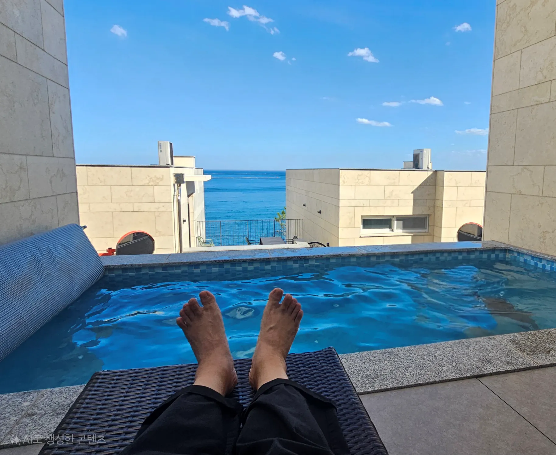 저희가 묵은 객실은 개별 풀장이 있는 타입으로, 객실 안에서 바로 바다를 감상할 수 있었습니다. 가족 모두가 함께 물놀이를 즐기며 시간을 보내기에 좋을것 같습니다.
