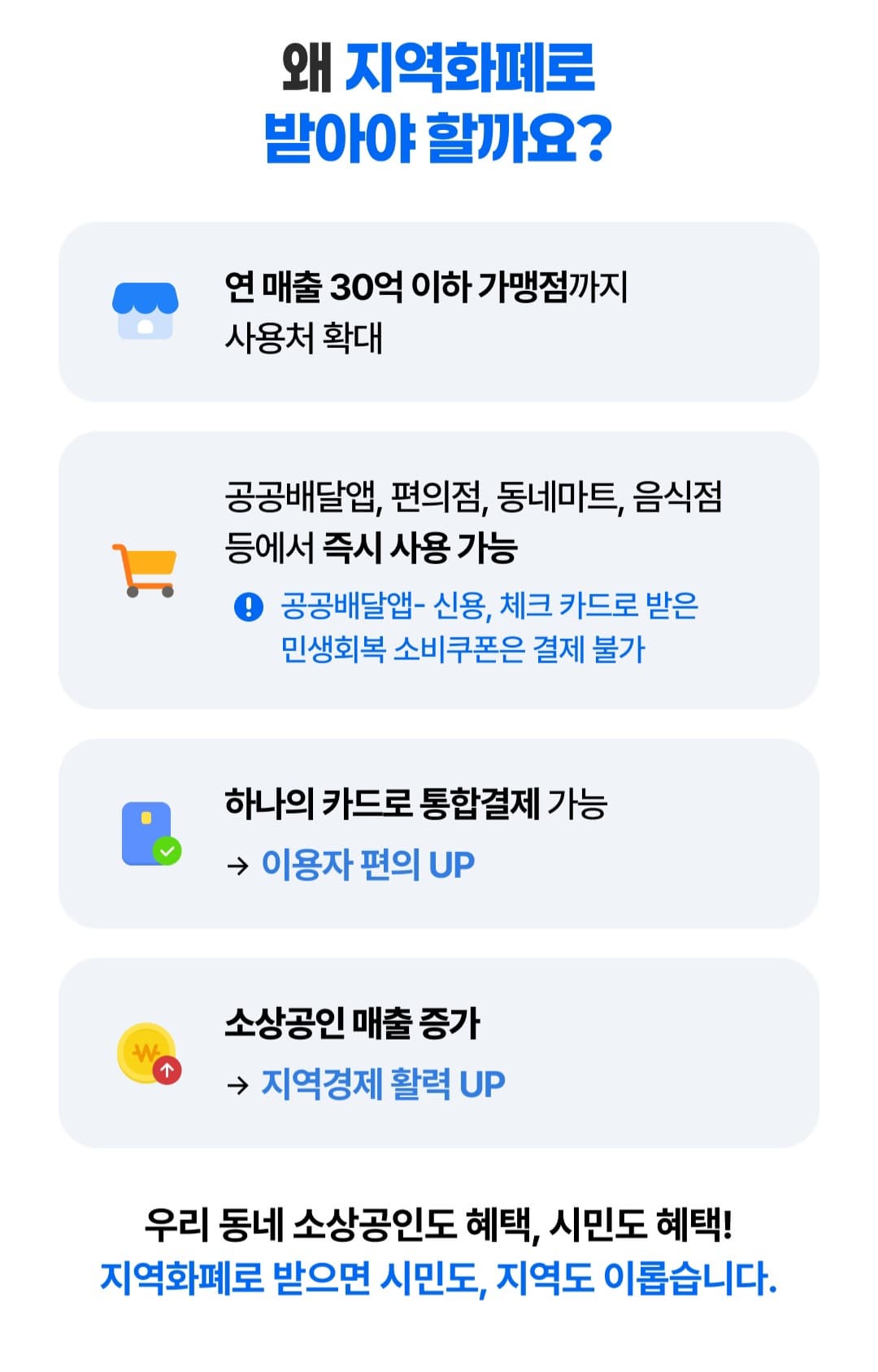 최근엔 대부분 지역화폐 형태로 지급되고, 정해진 곳에서만 사용할 수 있어요.