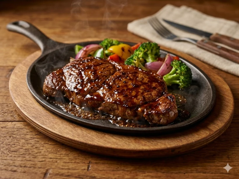 여기서 짝을 맞추기 좋은 메뉴가 바로 짐붐바 스테이크예요. 데리야끼 소스가 베이스라서 굽기를 따로 고민할 필요가 없어요. 미디엄 웰던 상태로 기본 조리되어 나오는데, 단짠 맛의 균형이 잘 잡혀 있어서 스테이크에 익숙하지 않은 분도 부담 없이 즐길 수 있어요.